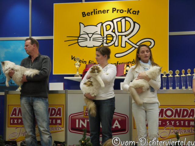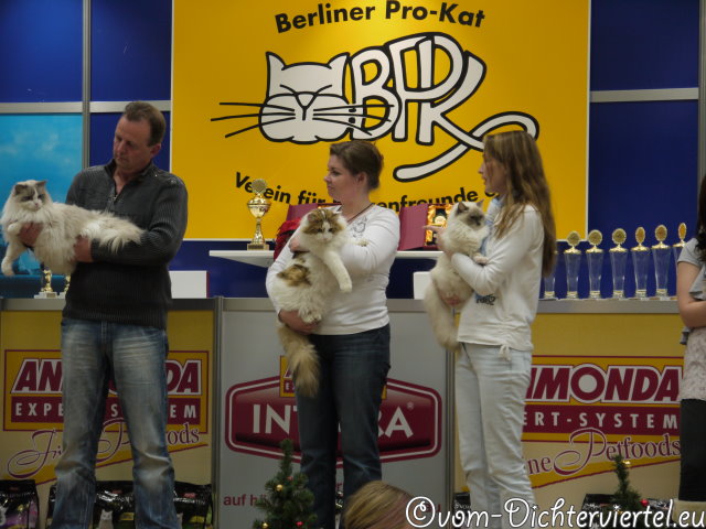 Wir hatten Amy, Hexi und PiVi dabei. Es war ein langer anstrengender Tag. Aber Hexi hat ihren dritten und damit letzten Punkt für den 'Großen Internationalen Champion' bekommen. Somit braucht sie jetzt erst einmal nicht mehr mit zu Ausstellungen. Vielleicht in ein paar Jahren wieder, wenn sie sich noch weiter entwickelt hat und auch schon ein paar Würfe hatte. Schließlich sind Norweger erst mit vier bis viereinhalb Jahren ausgewachsen.